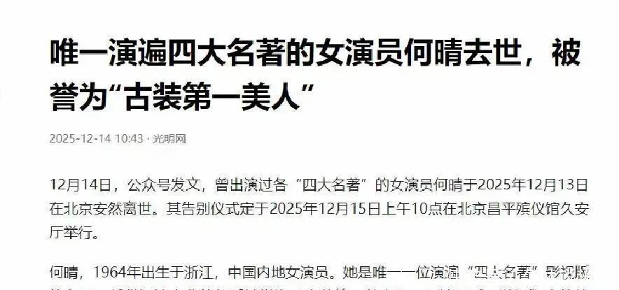 12月中旬的北京,殡仪馆的告别时间被定在15日。名单里,何晴三个字格外刺眼——前一天,媒体刚确认她在13日离世,享年61岁。